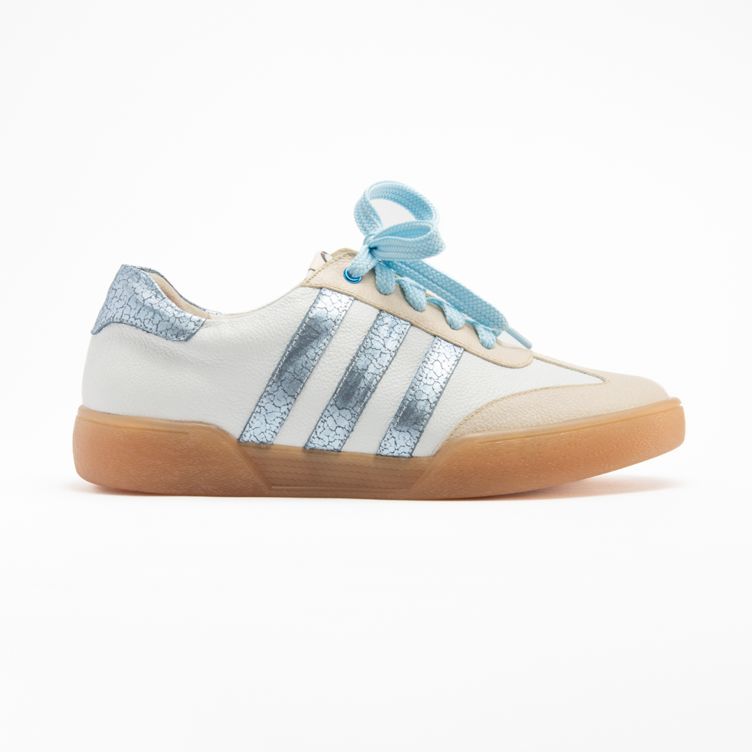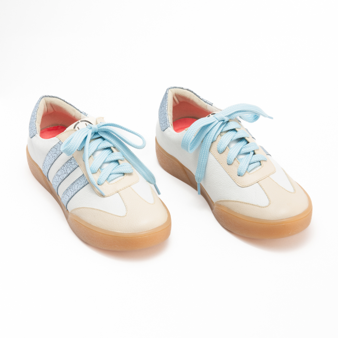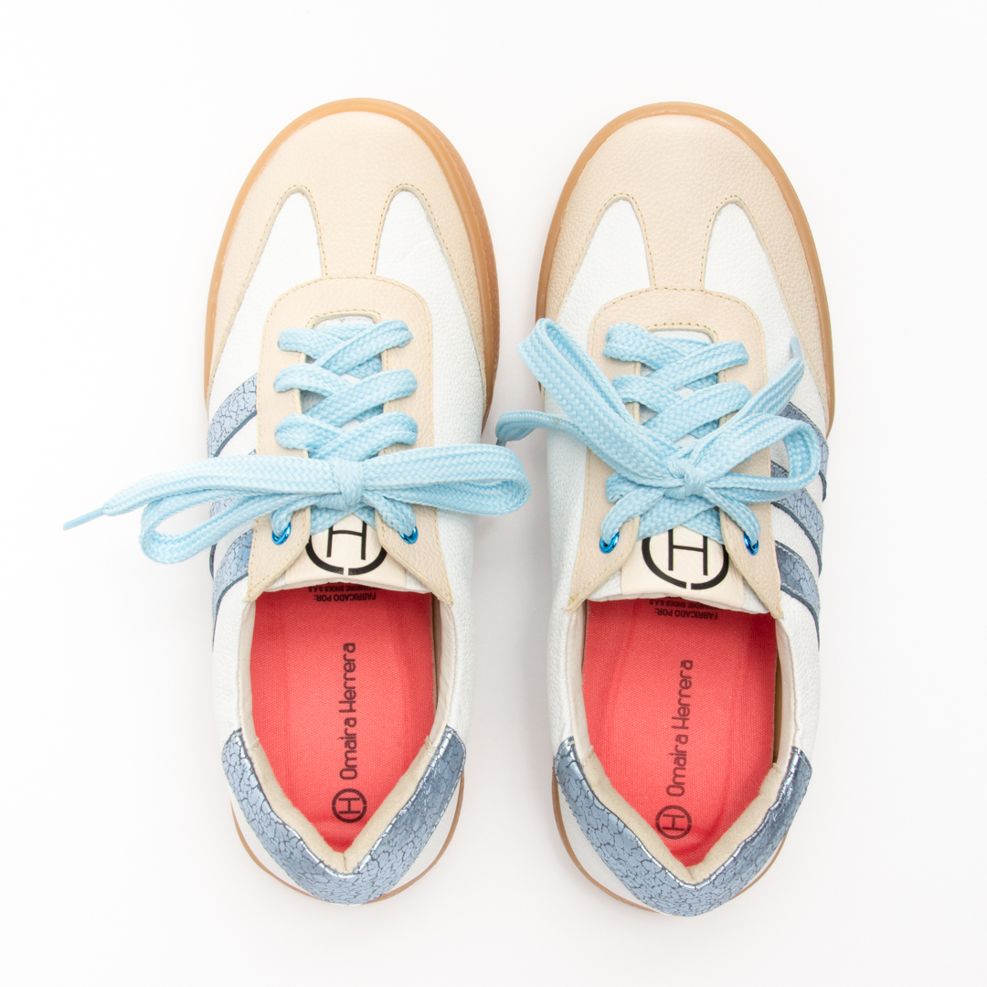 Tenis plano blanco- tres lineas celeste